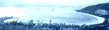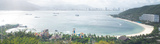 Panorama giant water park complex multiple rides slide pools with obstacle course on the beach, watercraft, multistory hotel resort, downtown Nha Trang skylines mountain range background