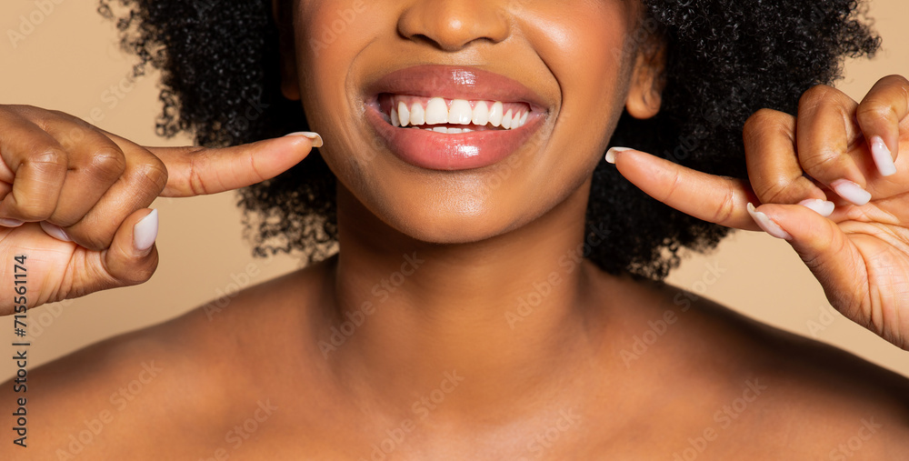 Smiling black woman pointing to her healthy white teeth
