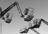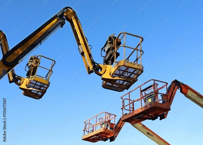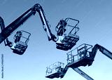 Two aerial working platforms of cherry pickers in front of other two. Blue sky background.