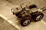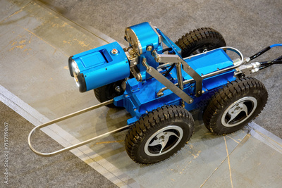 Industrial robot for pipeline inspection. Machine for studying breakdowns inside pipes. Pipeline repair robot. Modern production equipment. Engineering robot close-up. Industrial technology