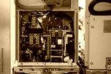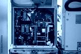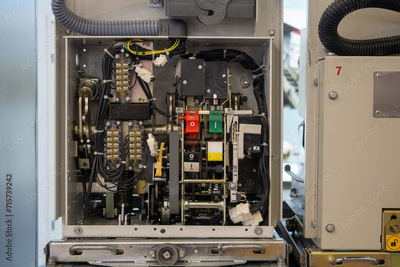 Electrical equipment inside. Disassembled machine control panel. Electrical appliance been opened for repair. Industrial equipment been dismantled for repairs. Wires and adapters inside metal cabinet