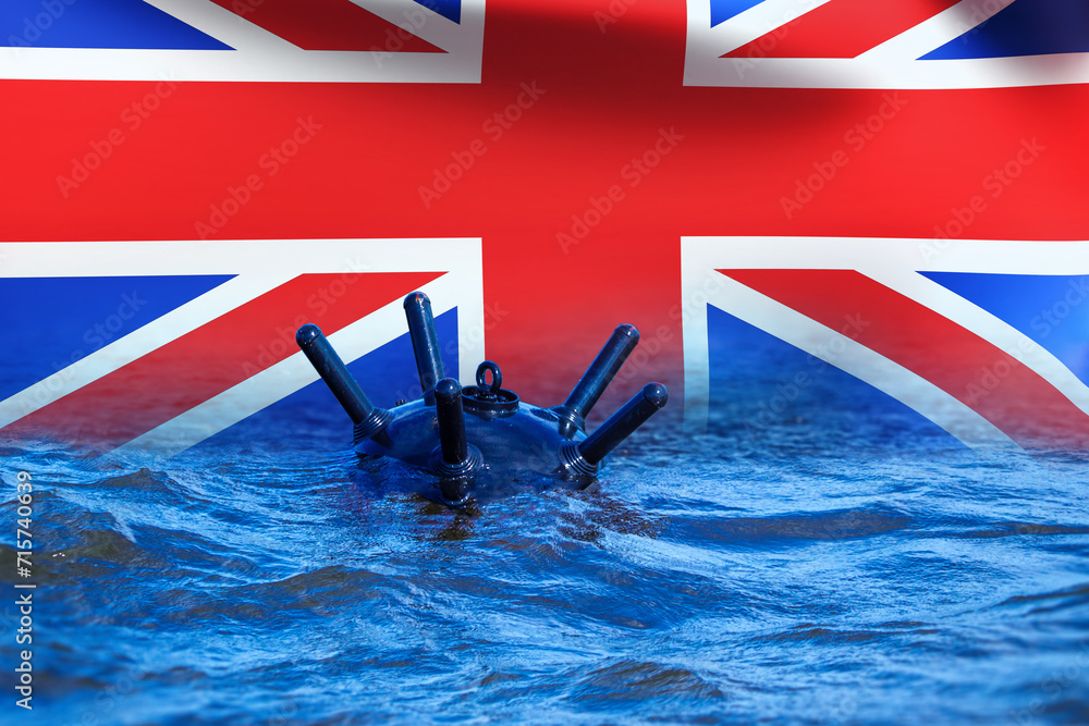 Underwater mine. Flag of Great Britain. Naval bomb over water. National symbol of United Kingdom. Underwater bomb made in Great Britain. Naval weapons UK. Mine for protection of sea borders. 3d image