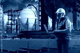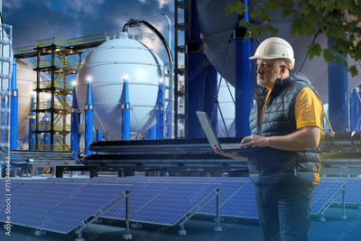 Man electrical station engineer. Solar panels near factory. Factory with tanks for storing liquefied gas. Night electrical station. Man technician with laptop. Inspector controls electrical station