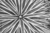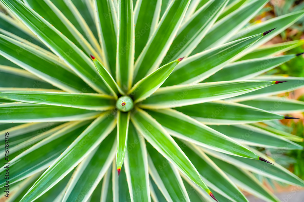Agave with wide star shaped leaves radiating out with green shades of light stripes, abstract top view