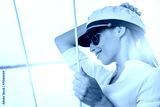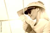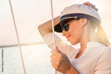Adorable model wearing sea admirals hat and sexy top at sunset.