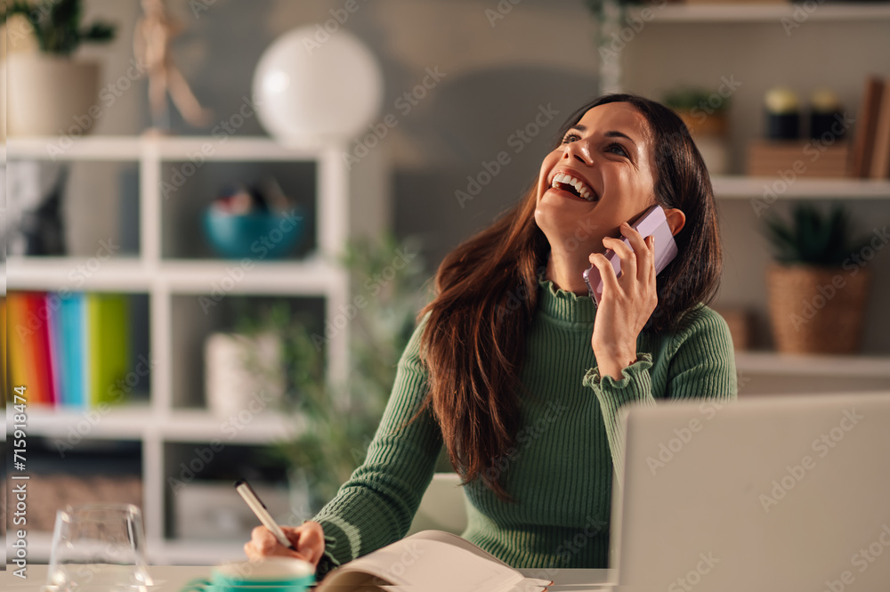 Laughing woman talking on a smartphone while taking notes during a phone call