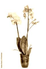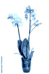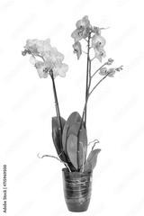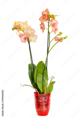 Beautiful yellow orchid in pot. Orange, yellow and pink stripy phalaenopsis orchid in bright red pot, isolated on white background.