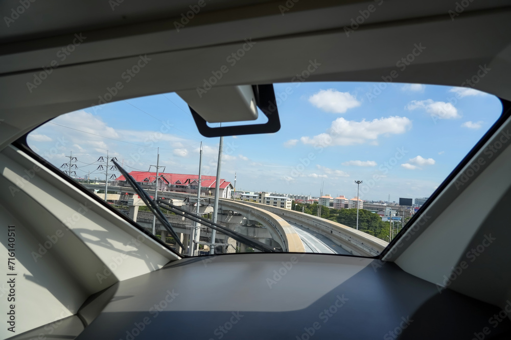 Turn view inside windshield driver cockpit cabin control panel, passenger monorail line turn, autopilot sky train station platform.