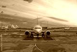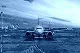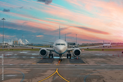 Passenger planes parked in the air harbor during dawn sky.