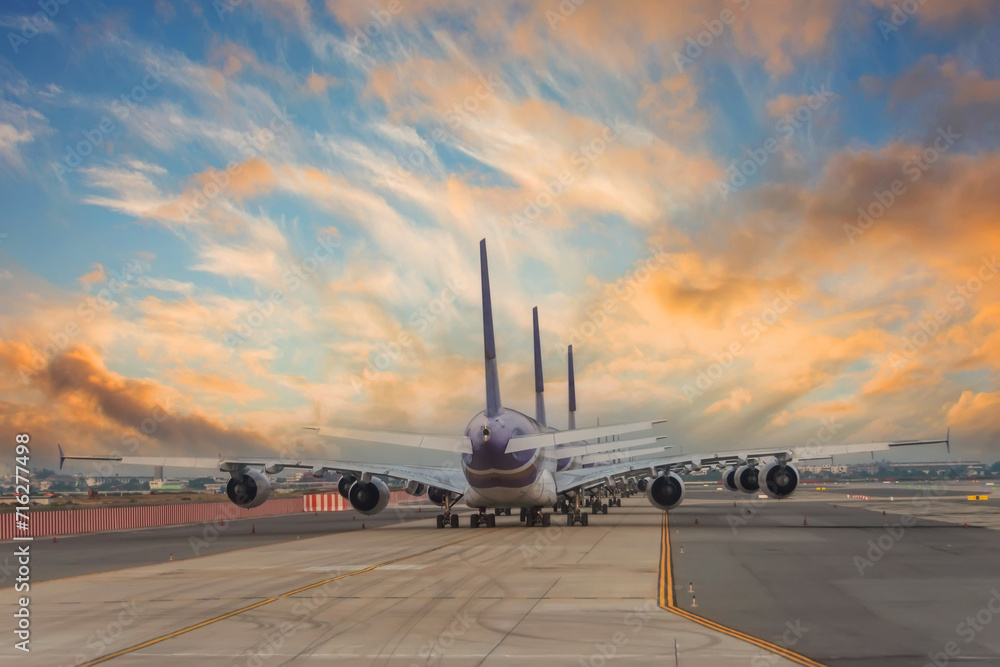 Huge airliners planes lined up in a row, rear view of the wings and tail during a bright dawn of a beautiful sky.