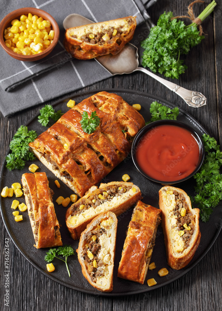 Breakfast Braid with ground beef, eggs, top view