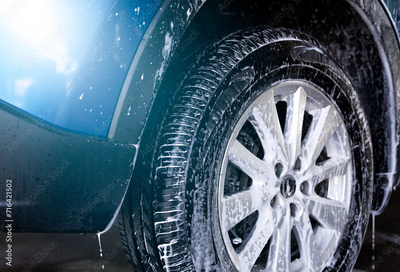 Blue car wash with white soap foam and professional auto care service. Car cleaning service concept. Vehicle cleaning service. Foam wash car detailing. Tire of car wheel is covered with white foam.