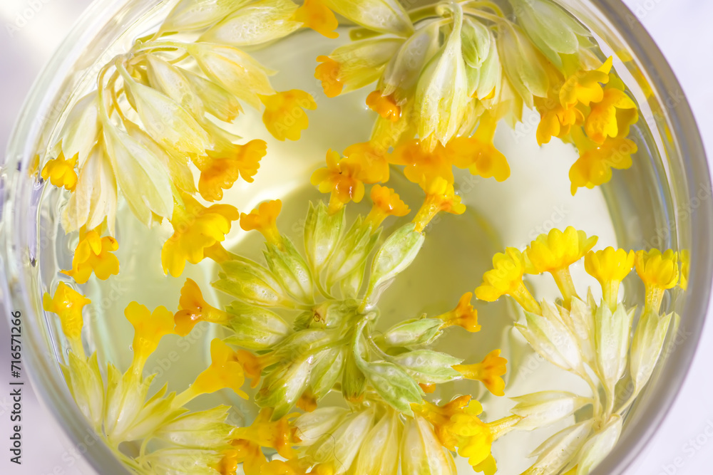 Herbal tea in a transparent cup.