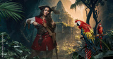 Pirate Woman with Parrot in Lush Jungle
