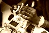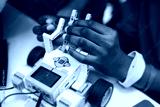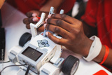 Group of diverse children kids with robotic vehicle model, close-up view on hands, science and engineering lesson in a classroom, making, coding and programming a robot in a school, robotics projects