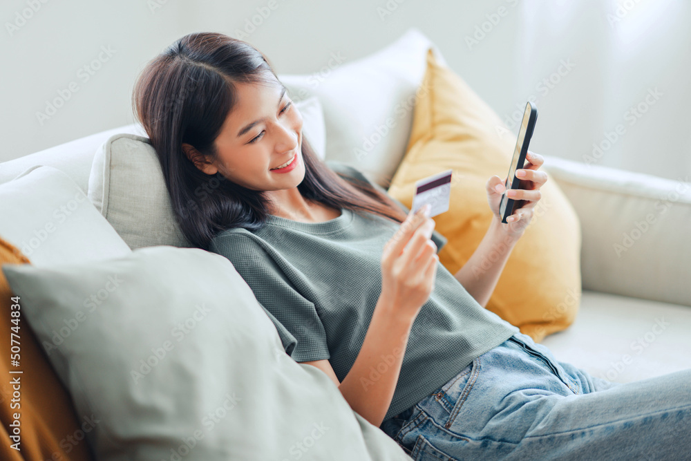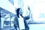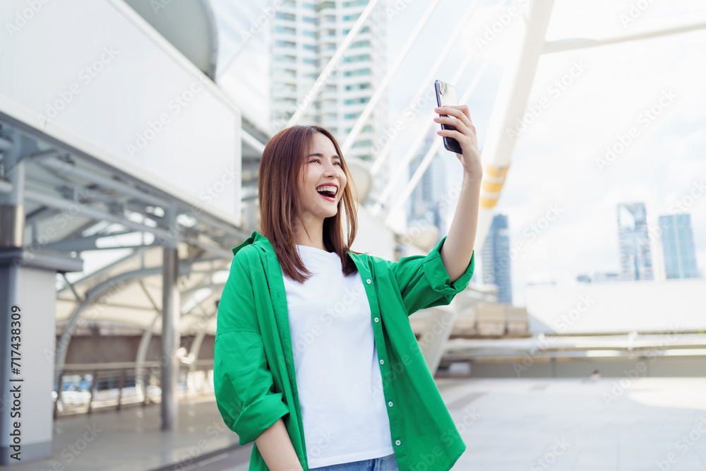 Cheerful beautiful Asian woman looking to smartphone at video call friends online through the internet.