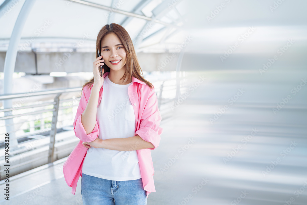 Cheerful beautiful Asian woman wearing pink shirt and stand with talking on the phone at walkway area.