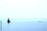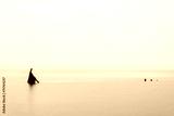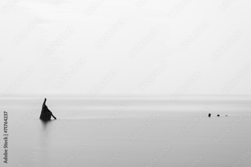Minimalist landscape image of shipwreck ruin in sea black and wh