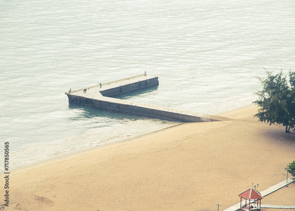 L shape concrete fishing pier with beach surf fishermen along sandy shoreline, calm waves at public park in downtown Nha Trang, Vietnam, tropical trees, overcast day, aerial view outdoors
