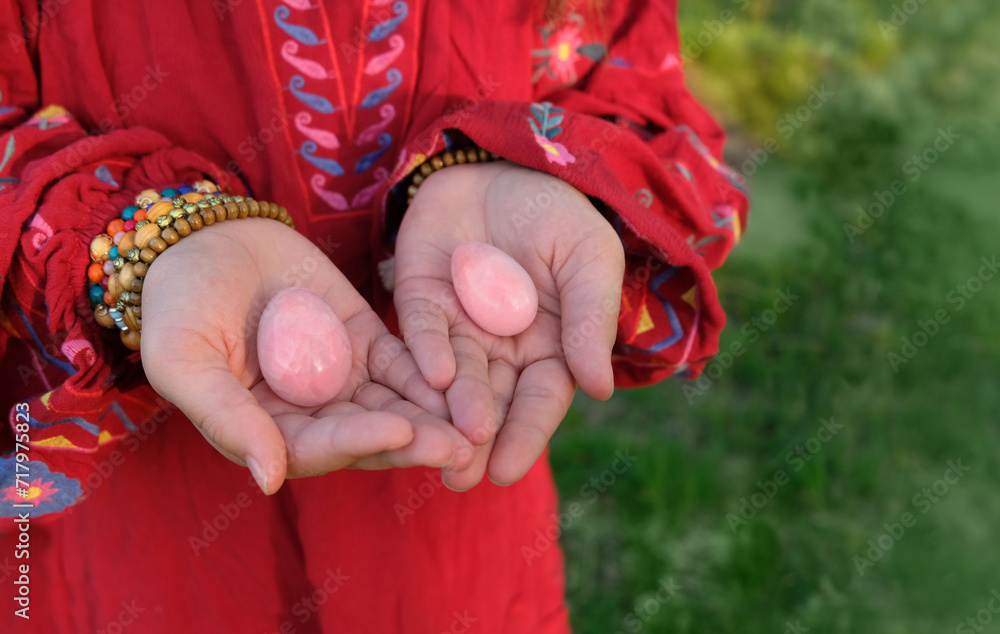 Girl holding in hands yoni eggs of rose quartz close up. Healing Rose Quartz Egg use for vumfit, imbuilding. spiritual, tantric practice, meditation. female energy, health concept.