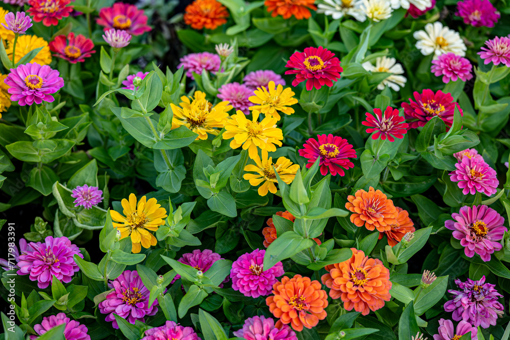 Colorful Zinnia flowers in the garden, yellow, pink, red, white, orange