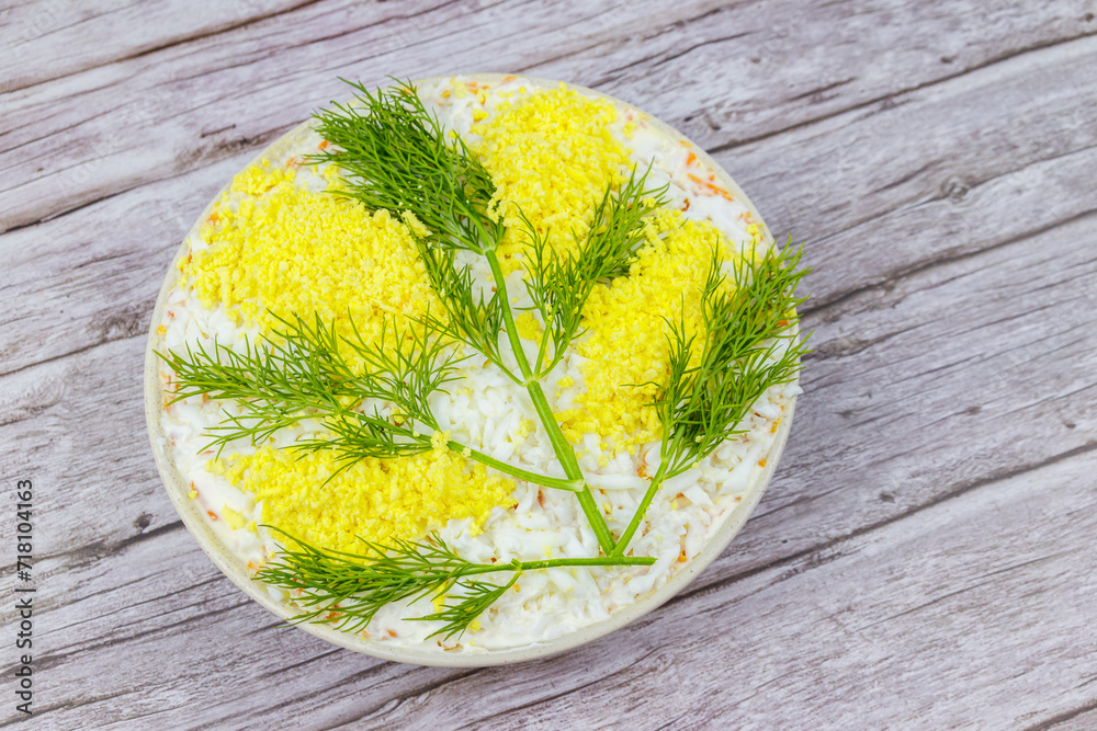 Traditional russian layered salad Mimosa decorated with sprigs of mimosa (made of eggs yolk and dill) on wooden table. Top view