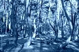 Grove of oddly shaped pine trees in Crooked Forest, Poland.