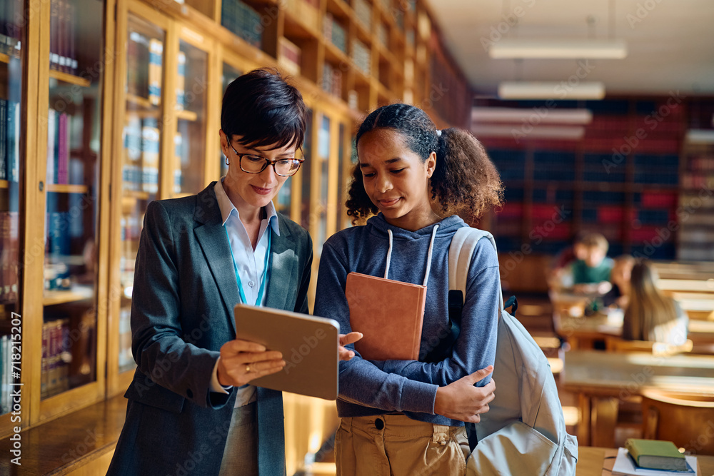 Black high school student and her teacher using digital tablet in classroom.