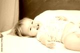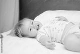 Child toddler girl in a diaper jumps on a bed with white sheets and laughs