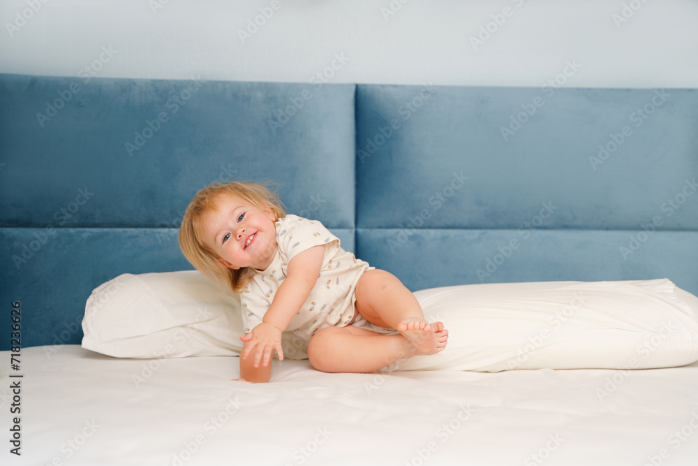 Child toddler girl in a diaper jumps on a bed with white sheets and laughs