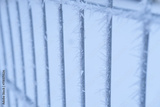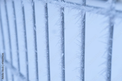 beautiful cold frost-covered fence with icy iron rods, crystal frost, frosty morning, winter weather concept, background for wallpaper
