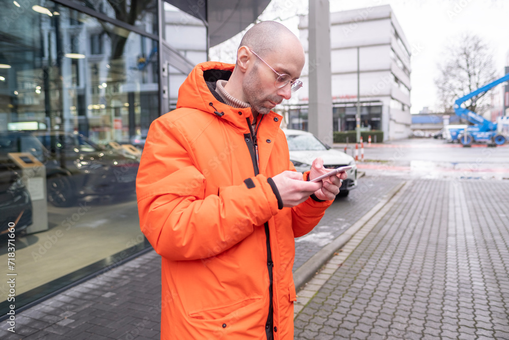 young 30-year-old man Outdoors uses smartphone on city street among modern buildings, European winter, Active Lifestyle, satellite communication, frosty weather