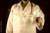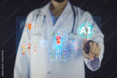 Doctor using computer AI in visual screen system for patient and data record on cloud computing