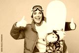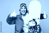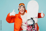 Young smiling happy woman wear warm padded windbreaker jacket hat ski goggles mask hold snowboard show thumb up travel rest spend weekend winter season in mountains isolated on plain blue background.