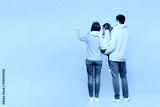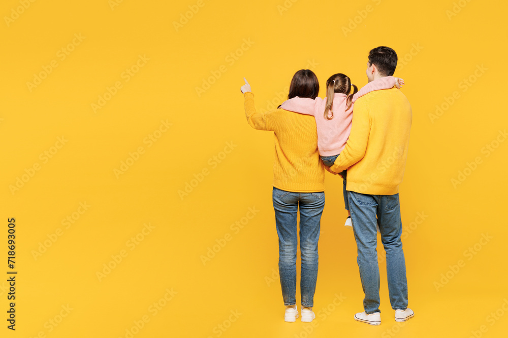 Full body back rear view young parent mom dad with child girl 7-8 years old wear pink sweater casual clothes hold kid point finger on empty area isolated on plain yellow background. Family day concept