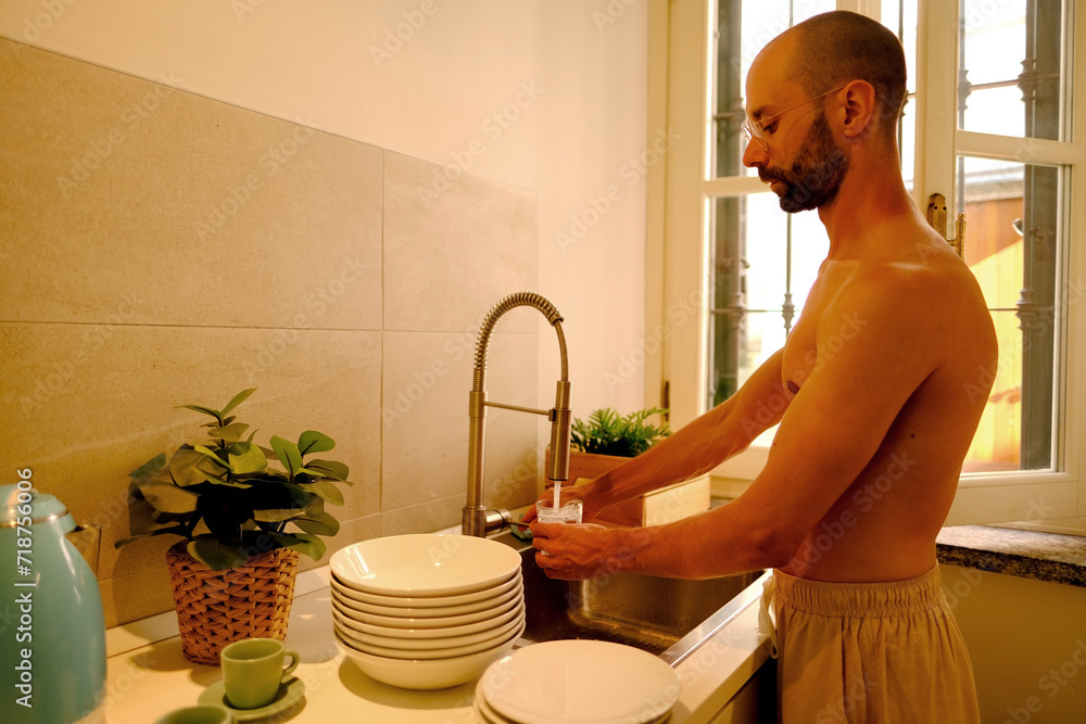 young man 30-35 years old washing dishes in modern kitchen, concept Kitchen Hygiene, Bachelor's Life Routine, Water Conservation,Household duties, shared responsibilities