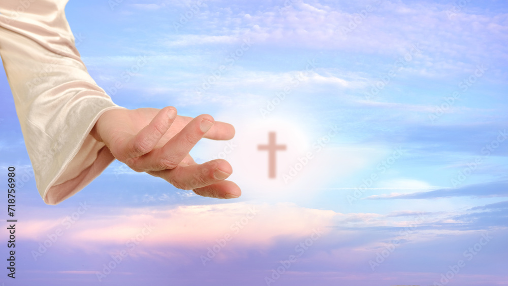 biblical scene, close-up of Jesus Christ Hand against sunset in evening beautiful dramatic sky ask for follow or following offer, offering, Holy Scriptures Old and New Testaments, Christian religion