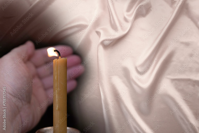 Close-up candle, female hand shield burning flame from wind, religious ceremonies and mourning rituals, solemnity and remembrance, spiritual meditation