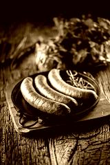 Pepper pork smoked sausages with rosemary in a cast iron pan