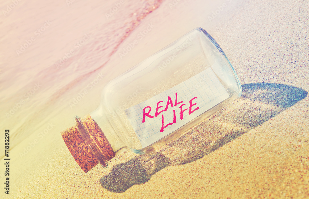 Message in a bottle "Real life" on sandy beach.