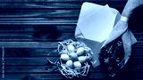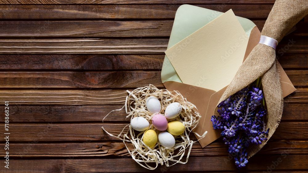 Easter concept with easter colorful eggs in the nest, envelope with blank card and bouquet of flowers. Wooden empty background with copy space. Flat lay