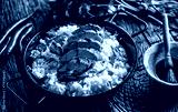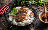 Grilled chicken breast served in a pan with jasmine rice and chili peppers