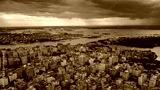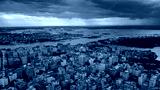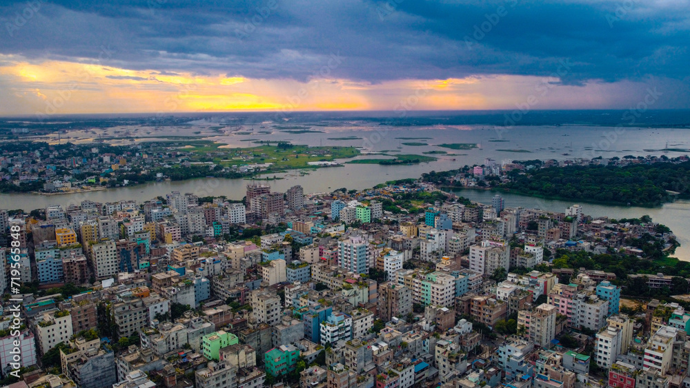 Aerial urban Sunset in a dense city by the water . Dhaka is the capital of Bangladesh and one of the most populated city in the World.