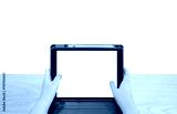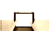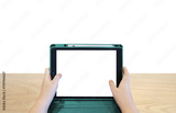 Boy's hands holding a tablet on a wooden table PNG transparent