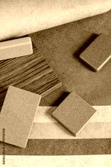 Close up combination of interior material containing set of artficial stone and wooden veneer samples. quartz stone and wooden laminated samples palette background. kitchen countertops color samples