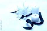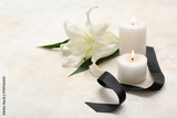 Burning candles, black funeral ribbon and lily flower on light background
