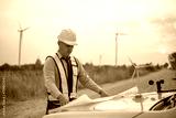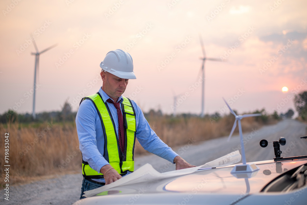 Engineer wearing uniform read blueprint document inspection work in wind turbine farms rotation to electricity,standing in front of car Model windmill and wind force meter is ecology energy concept.