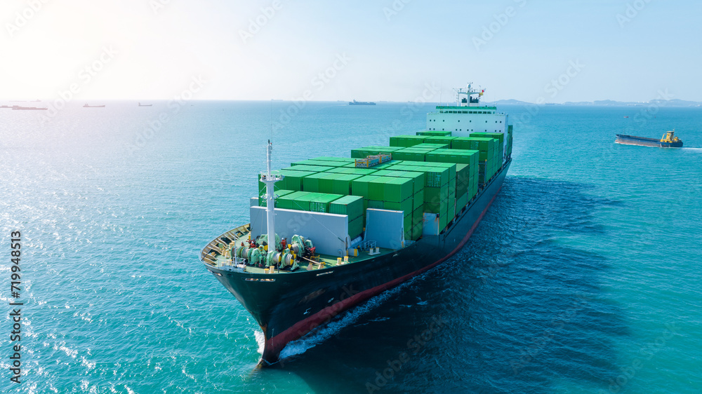Green Cargo Container Ship, Cargo Container only green color. container ship running in the ocean to shipyard sea port. import shipping freight logistics. Concept green transportation environment