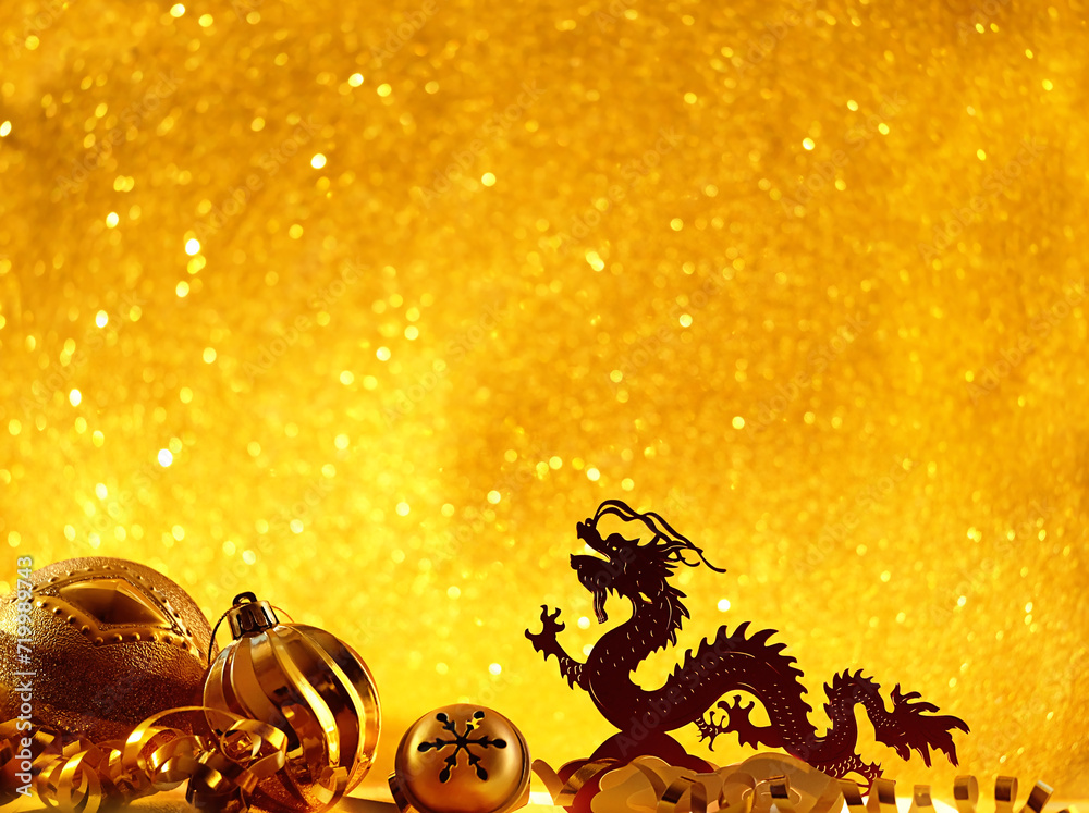 asian dragon and festive christmas decorations on golden shiny abstract glittering background. lunar new year 2024 symbol. element for design. copy space