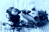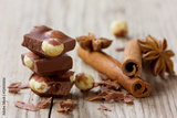 Milk chocolate slices with nuts, cinnamon sticks and anise star